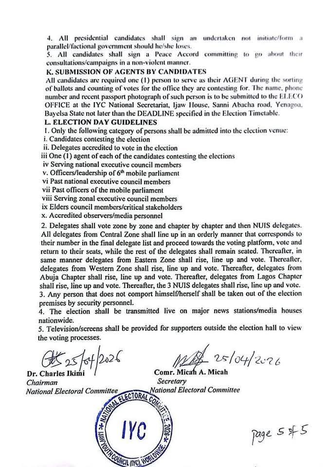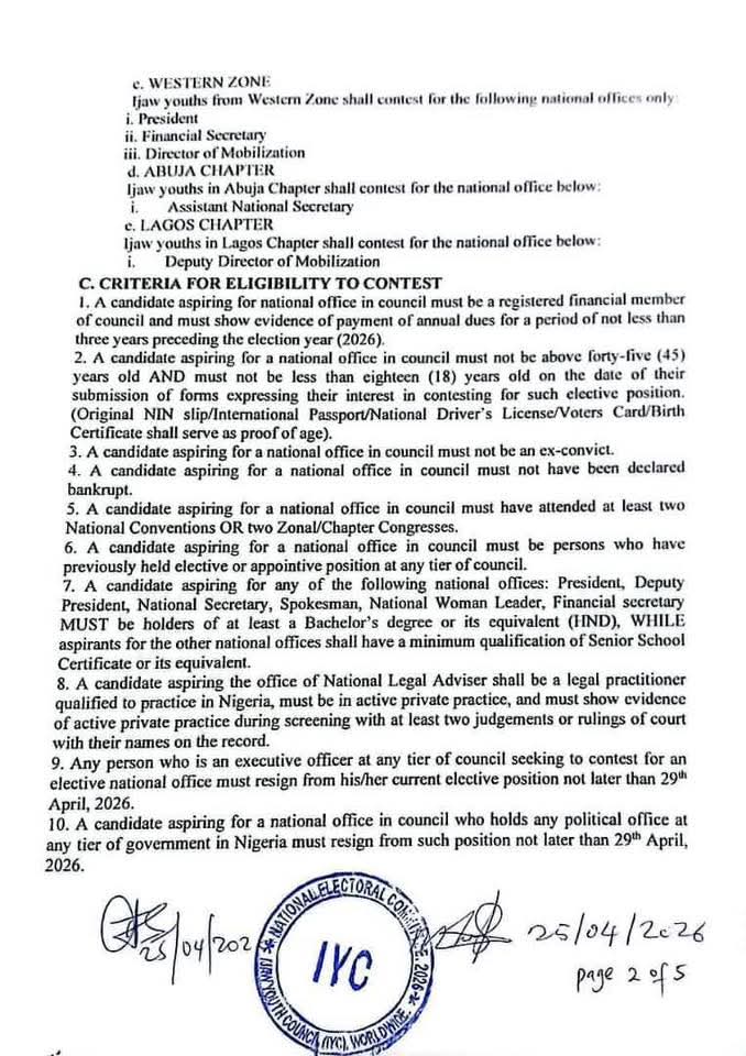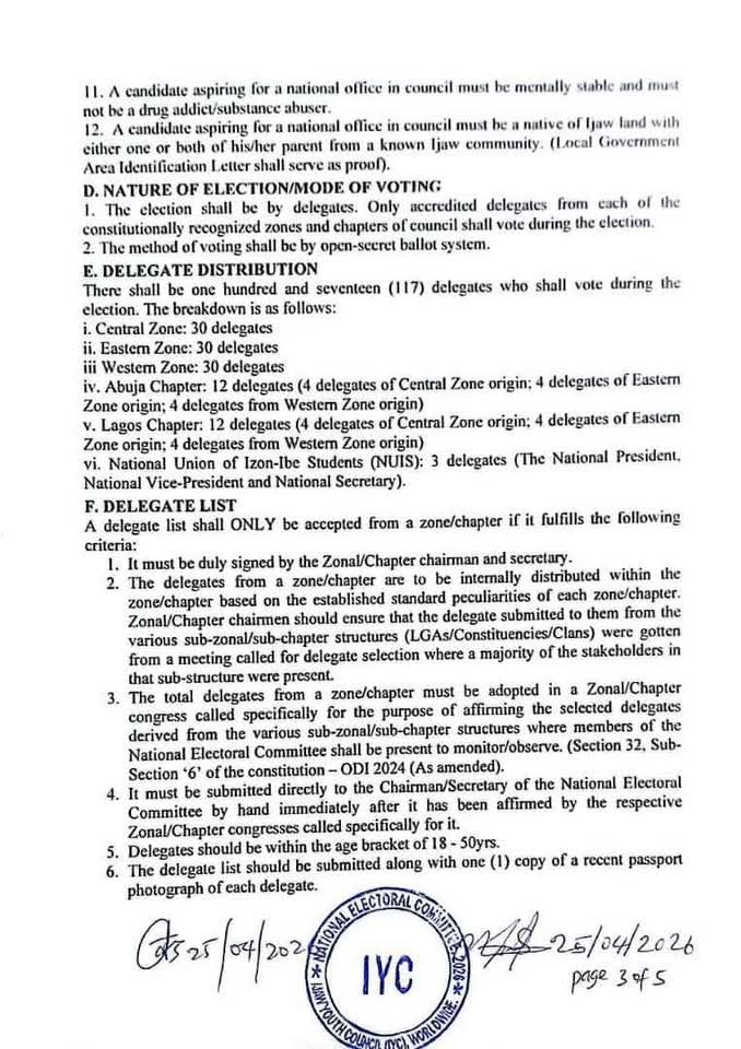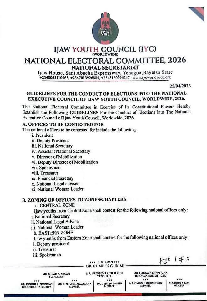 National Electoral Committee in Exercise of Its Constitutional Powers Hereby Establish the Following GUIDELINES For the Conduct of Elections into The National Executive Council of Ijaw Youth Council, Worldwide, 2026.