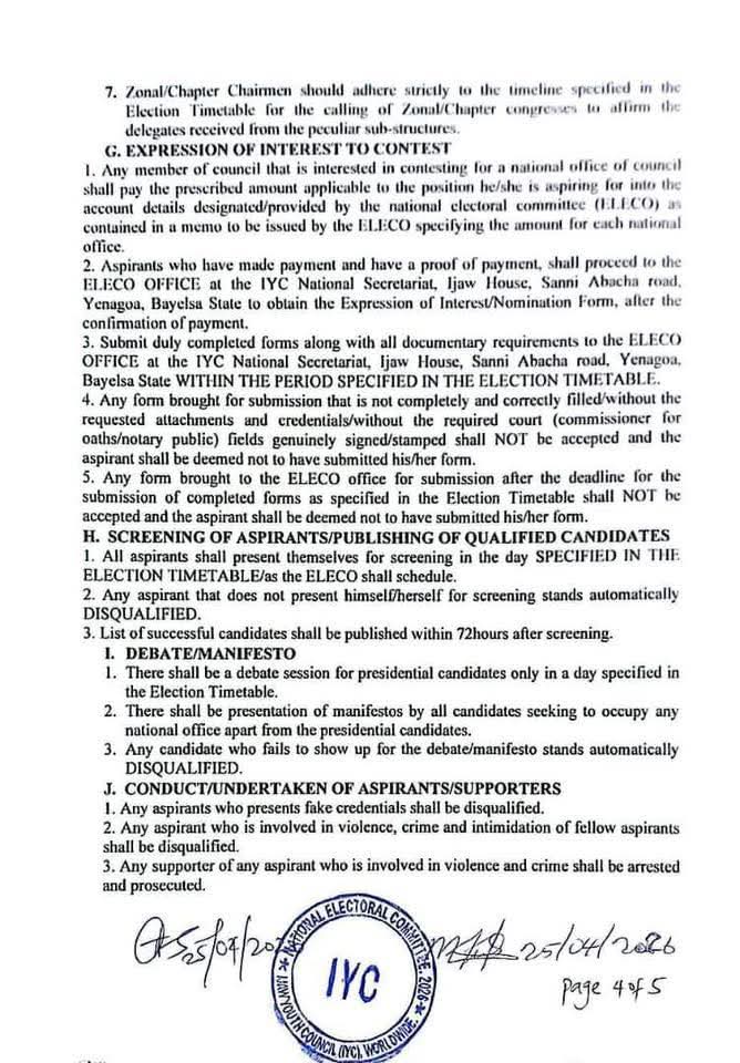 9. Any person who is an executive officer at any tier of council seeking to contest for an elective national office must resign from his/her current elective position not later than 29th April, 2026.