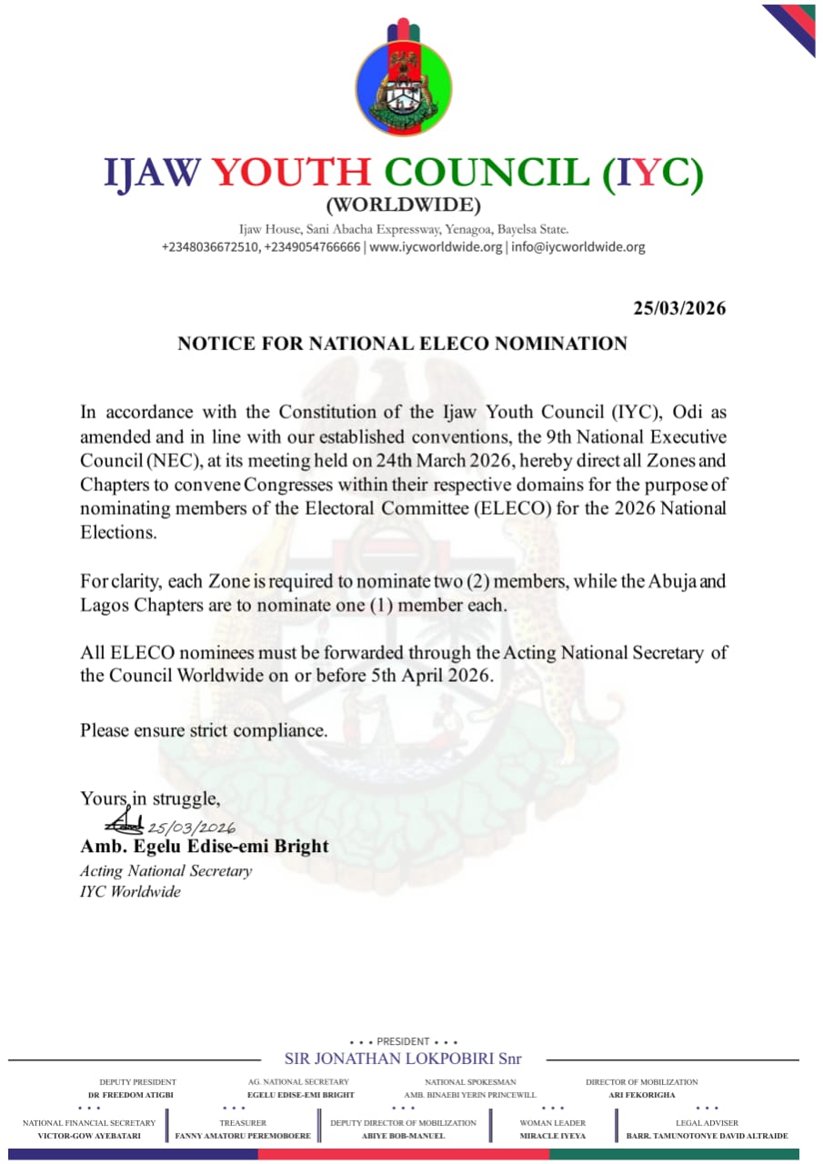 In accordance with the Constitution of the Ijaw Youth Council (IYC), Odi as amended and in line with our established conventions, the 9th National Executive Council (NEC), at its meeting held on 24th March 2026, hereby direct all Zones and Chapters to convene Congresses within their respective domains for the purpose of nominating members of the Electoral Committee (ELECO) for the 2026 National Elections.