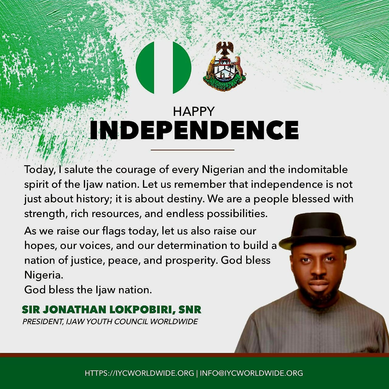 The Ijaw Youth Council (IYC) Worldwide, under the leadership of its Revered President, Sir Jonathan Lokpobiri Snr, joins millions of Nigerians and the good people of Bayelsa State in commemorating two significant milestones: Nigeria’s 65th Independence Anniversary and Bayelsa State’s 29th anniversary of creation.